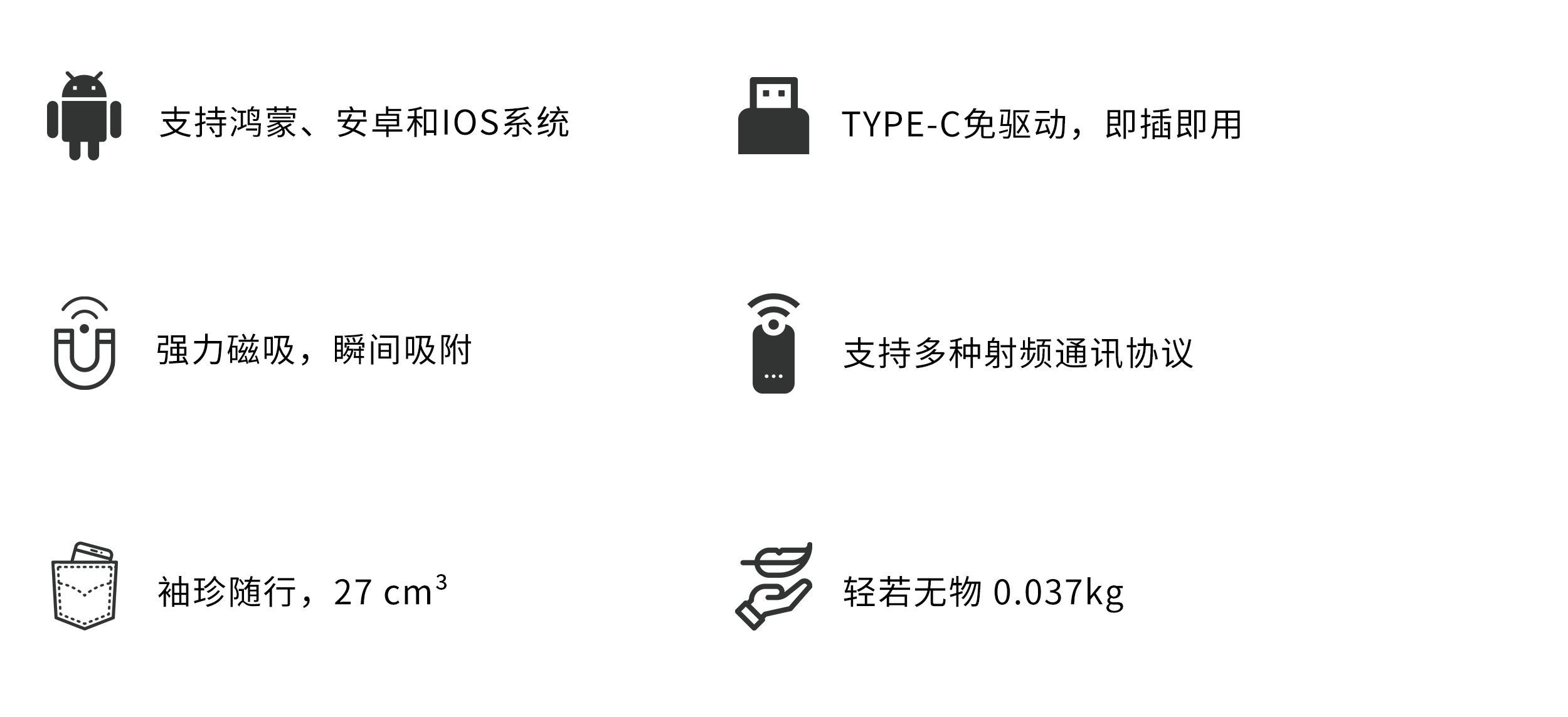 支持鸿蒙系统、安卓和IOS。免驱动,即插即用。提供RFID小灵通小程序和APP使用。
